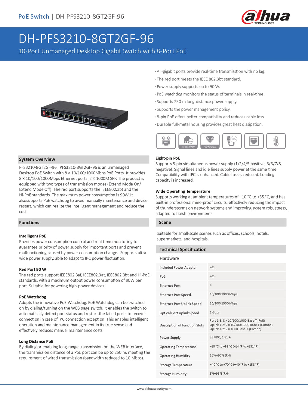 Dahua Gigabit Cloud Managed Switch 10 Port : 8X POE, 2X SFP, 2X Uplink 96W