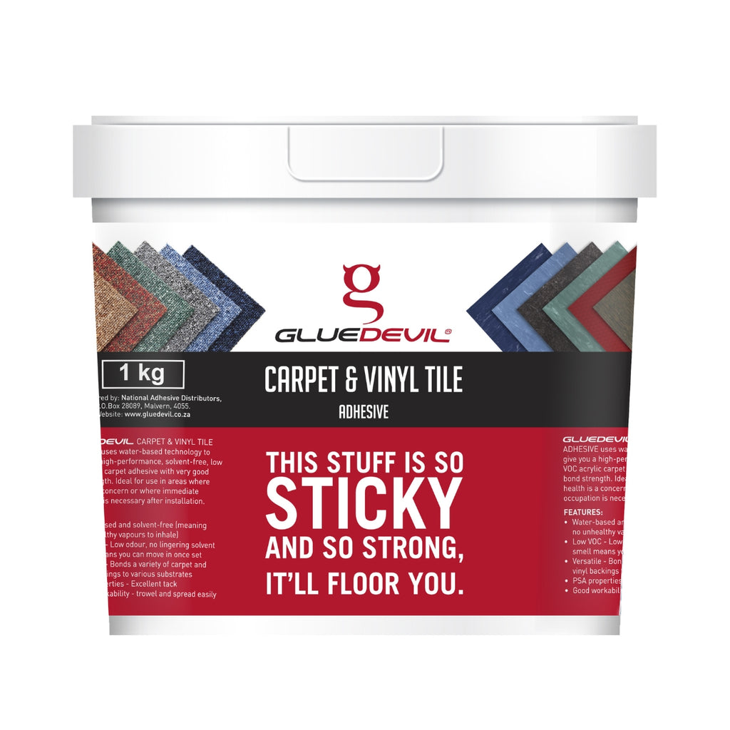 Gluedevil Floor And Vinyl Tile Adhesive Is A High Quality One Part Adhesive. For Installation Of Carpet Tiles, Vinyl Tiles Or Other Floor Coverings With A Vinyl Backing. Interior Residential Flats, Duplexes, And Houses. Interior Commercial Office Buildings, Hotel Rooms Or Restaurants. Interior Institutional Hospitals, Schools, Universities, And Libraries. Bonds A Variety Of Floor Coverings To Concrete, Screed, Wood, And Absorbent Surfaces. Not For Use In Damp Areas. For Best Results Apply With A V Notched Trowel Applying More For Carpeting And Absorbent Tiles. Allow 35 To 50 Minutes For Water To Flash Off, Surface Becomes Very Tacky. Fit Floor Covering And Apply Firm Pressure With Roller. Easy To Use Water Borne Adhesive. Forms A Permanent Long Lasting Bond After Curing. Non Flammable Product. Application Tools Can Be Cleaned With Soapy Water. For More Information And Advice On The Safe Handling, Storage And Disposal Of Chemical Products, Users Shall Refer To The Most Recent Material Safety Data Sheet Containing, Physical, Ecological, And Toxicological And Other Safety Related Data.
