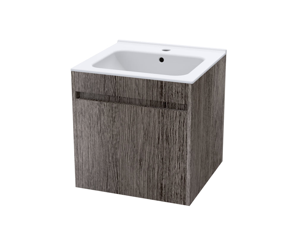 The Zara 495mm Wall Hung Stone Cabinet with Ceramic Basin includes a durable ceramic basin and a wrapped melamine wood cabinet in an Aged Stone finish.