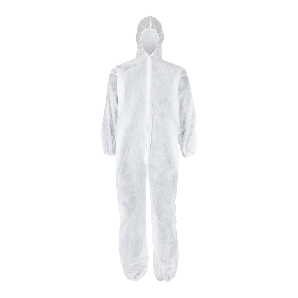 White Disposable Coverall With Hood, Front Zipper, Elastic Cuff, Ankle, Non Woven 5gsm, Application, Asbestos Stripping, Cleaning, Construction And Painting.
