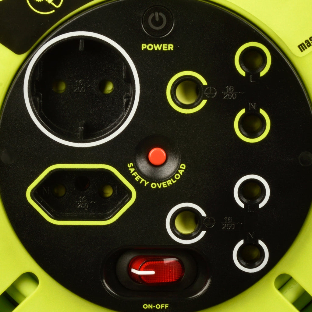 • SAFETY FEATURES: Thermal cut-off with LED power indicator, prevents the cable overheating when fully reeled and allows you to reset if a cut-out occurs. High visibility cable colour, ensuring safe practice in whatever environment it is used.