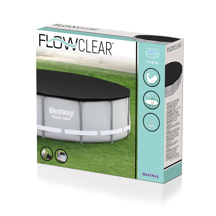 Keep debris, leaves, and trash from getting into your pool with this Flowclear pool cover. Above ground swimming pool covers prohibit algae growth and reduce costly replacement chemicals when the pool is in not in use. This pool cover has drain holes to prevent water from accumulating on the cover. The pool cover is easy to install, extremely durable and includes ropes to secure the cover to the pool. Fits Ø4.27m/14' Power Steel pools.