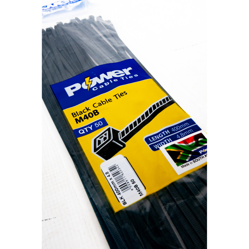 Seagull Nylon Black Power Cable Ties (400mm x 4.8mm): Manufactured in South Africa from high-quality nylon, these Black Cable Ties are both easy to use and essential for any toolbox. They are versatile, easy to thread and tighten, and suitable for both indoor and outdoor use. They are resistant to most substances, except for inorganic acids, cresols, oxidizing agents, and chlorine.