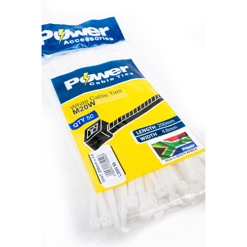 Seagull Nylon White Power Cable Ties (200mm x 4.8mm): Manufactured in South Africa from high-quality nylon, these White Cable Ties are both easy to use and essential for any toolbox. They are versatile, easy to thread and tighten, and suitable for indoor use. They are resistant to most substances, except for inorganic acids, cresols, oxidizing agents, and chlorine.