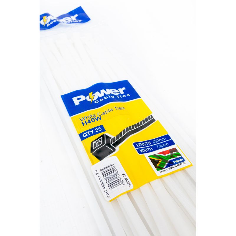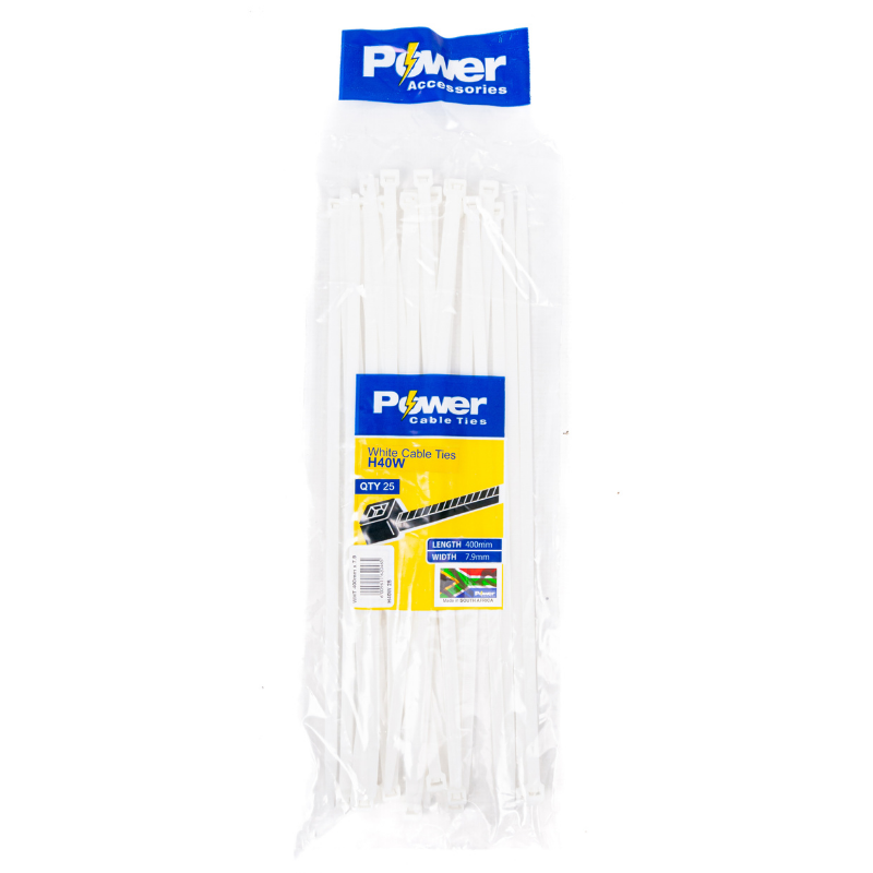 Seagull Nylon White Power Cable Ties (400mm x 7.9mm): Manufactured in South Africa from high-quality nylon, these White Cable Ties are both easy to use and essential for any toolbox. They are versatile, easy to thread and tighten, and suitable for indoor use. They are resistant to most substances, except for inorganic acids, cresols, oxidizing agents, and chlorine.