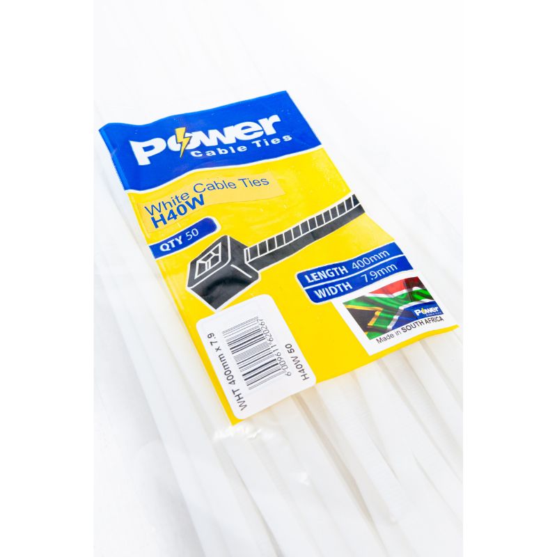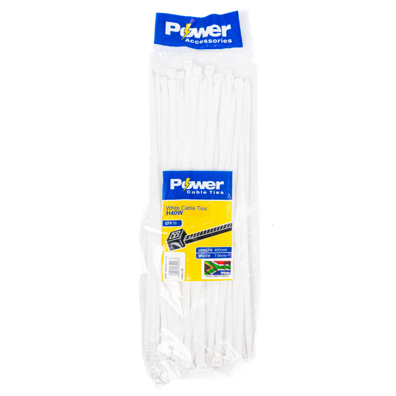 Seagull Nylon White Power Cable Ties (400mm x 7.9mm): Manufactured in South Africa from high-quality nylon, these White Cable Ties are both easy to use and essential for any toolbox. They are versatile, easy to thread and tighten, and suitable for indoor use. They are resistant to most substances, except for inorganic acids, cresols, oxidizing agents, and chlorine.