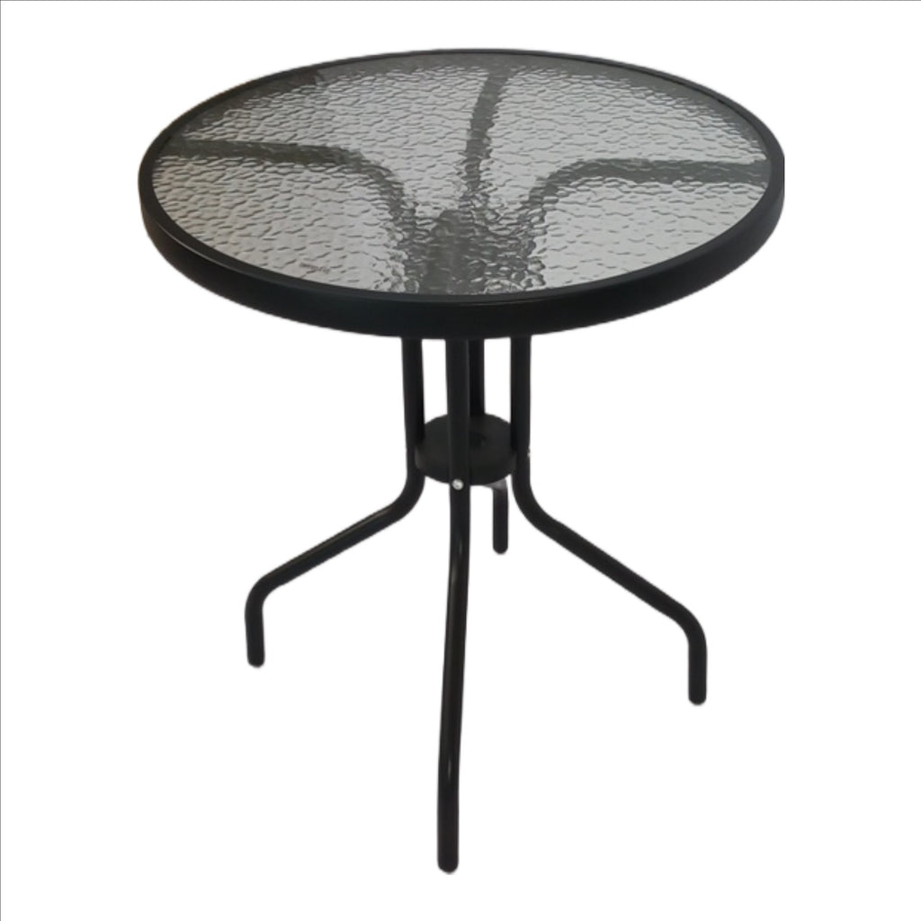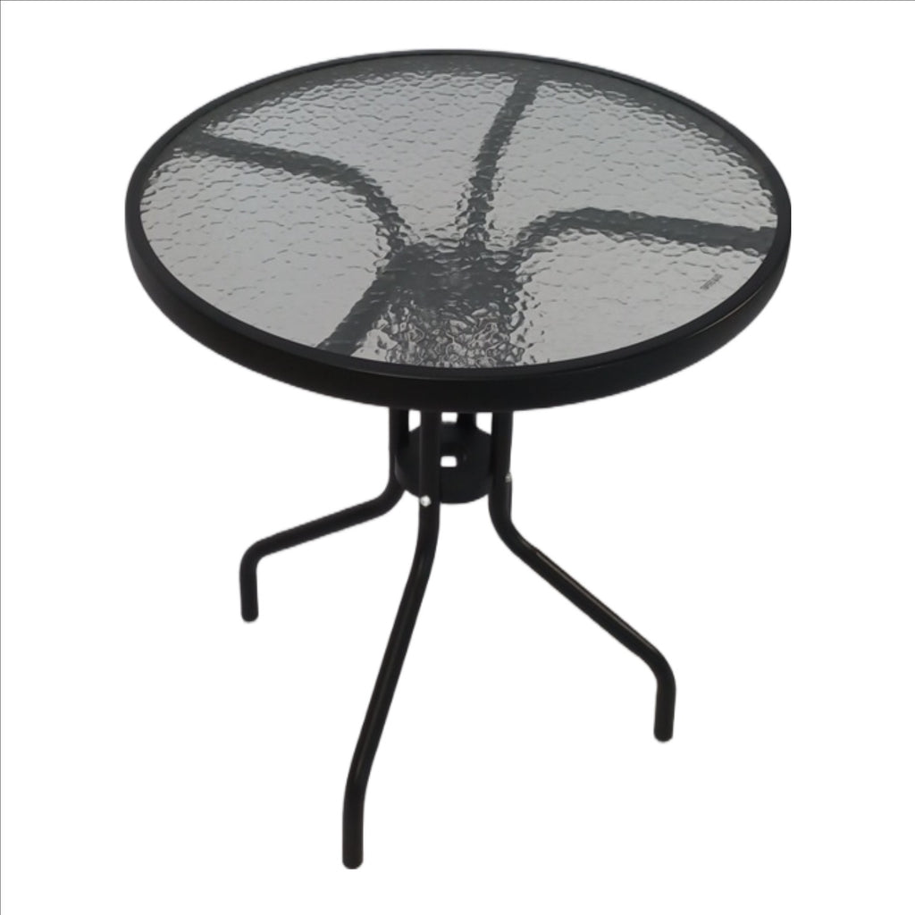 • Material: Steel frame, Wave-tempered glass top with centre hole (to allow parasol umbrella)