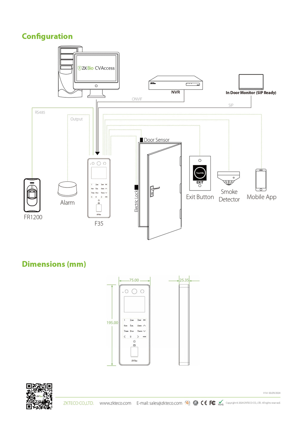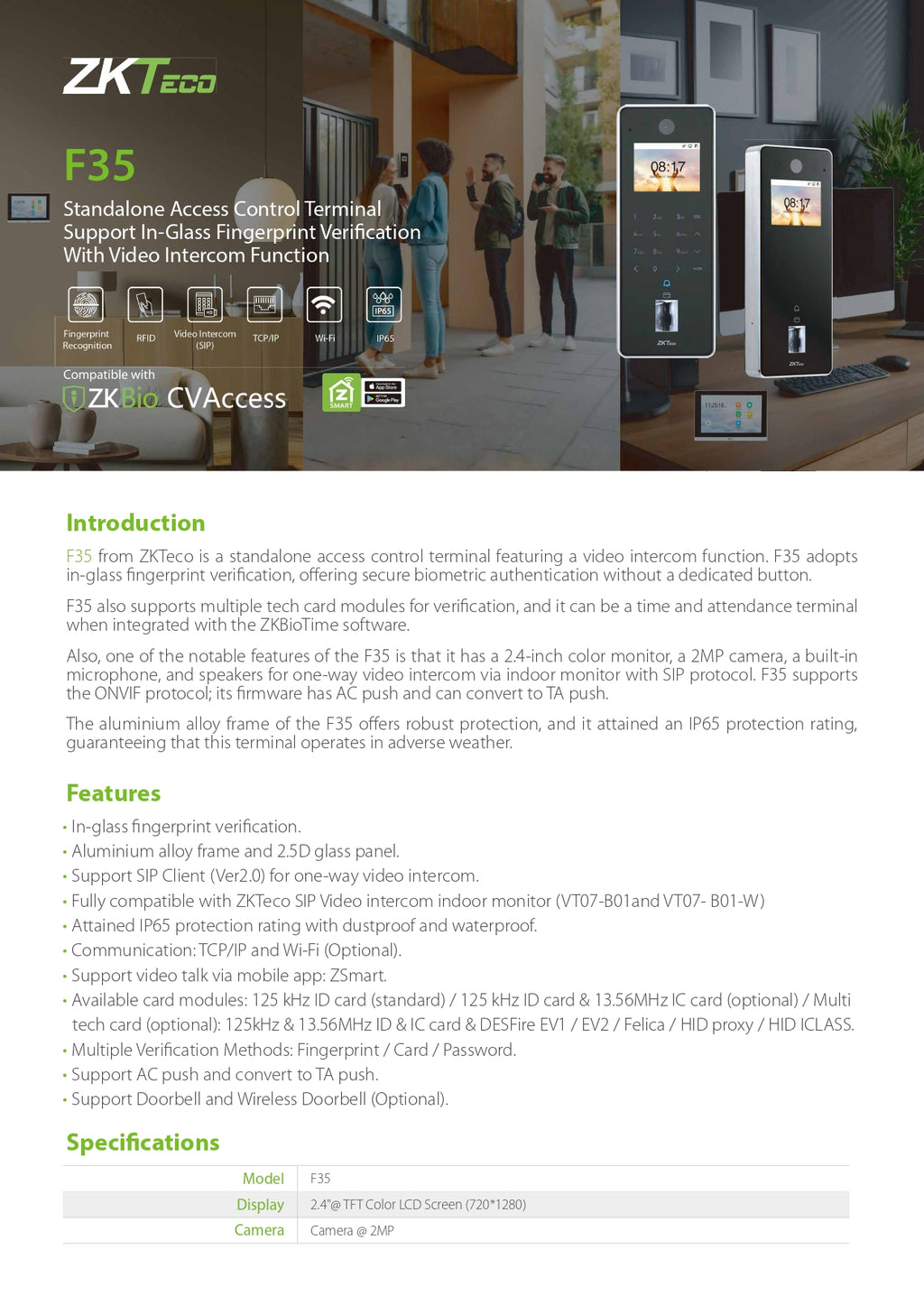 F35 from ZKTeco is a standalone access control terminal featuring a video intercom function. F35 adopts in-glass fingerprint verification, offering secure biometric authentication without a dedicated button. F35 also supports multiple tech card modules for verification, and it can be a time and attendance terminal when integrated with the ZKBioTime software. Also, one of the notable features of the F35 is that it has a 2.4-inch color monitor, a 2MP camera, a built-in microphone, and speakers for one-way video intercom via indoor monitor with SIP protocol. F35 supports the ONVIF protocol; its firmware has AC push and can convert to TA push. The aluminium alloy frame of the F35 offers robust protection, and it attained an IP65 protection rating, guaranteeing that this terminal operates in adverse weather.