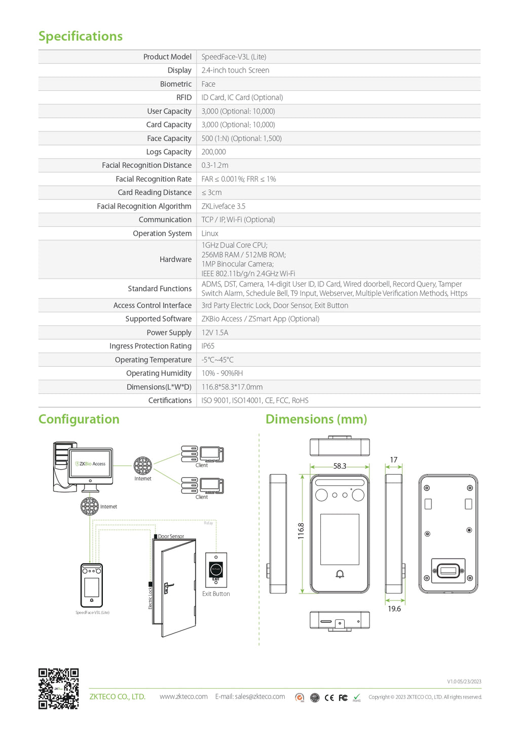 Also, SpeedFace-V3L (Lite) complies with IP65 protection rating and the device is waterproof and dustproof.