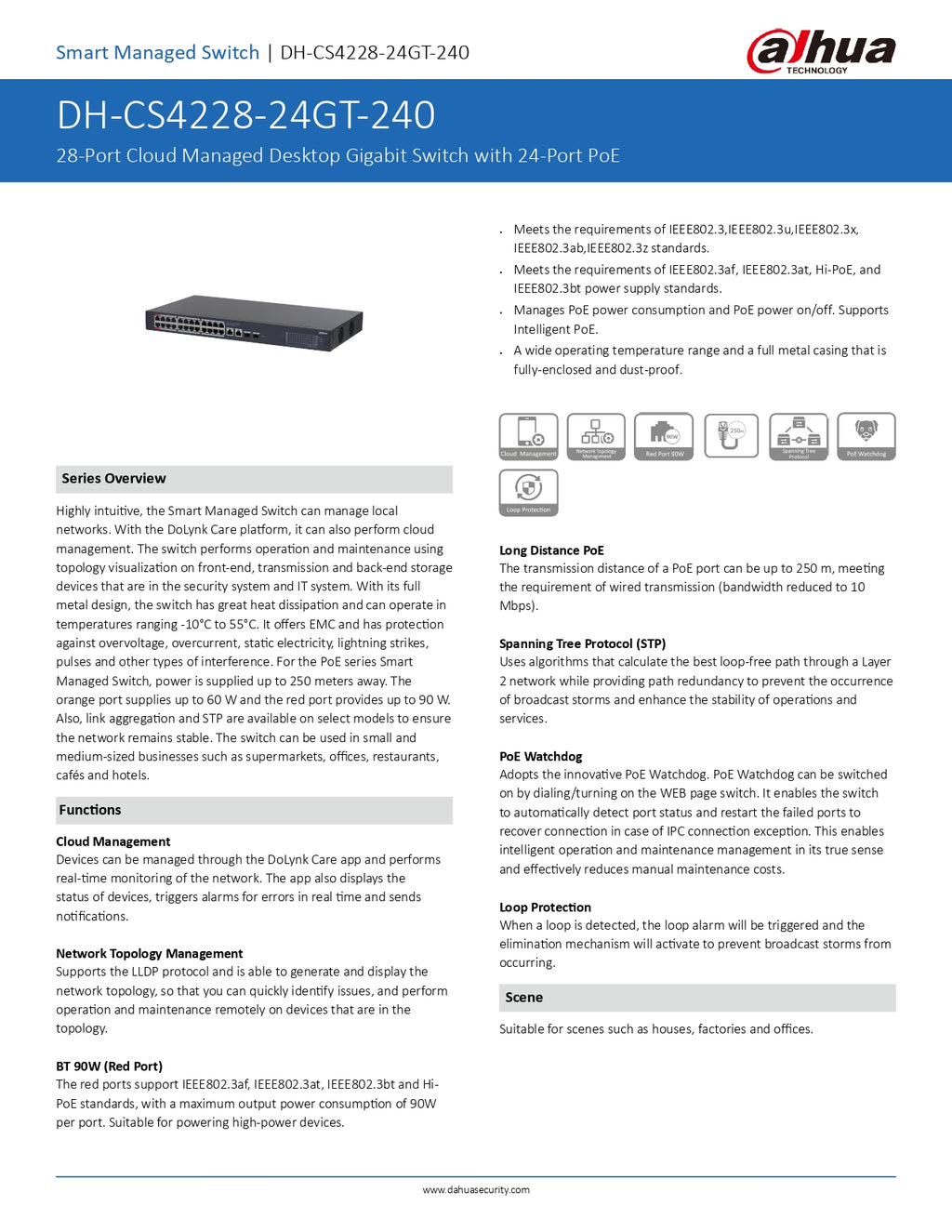 Dahua Gigabit Cloud Managed Switch 28 Port : 24X POE, 2X SFP, 2X Uplink, 240W