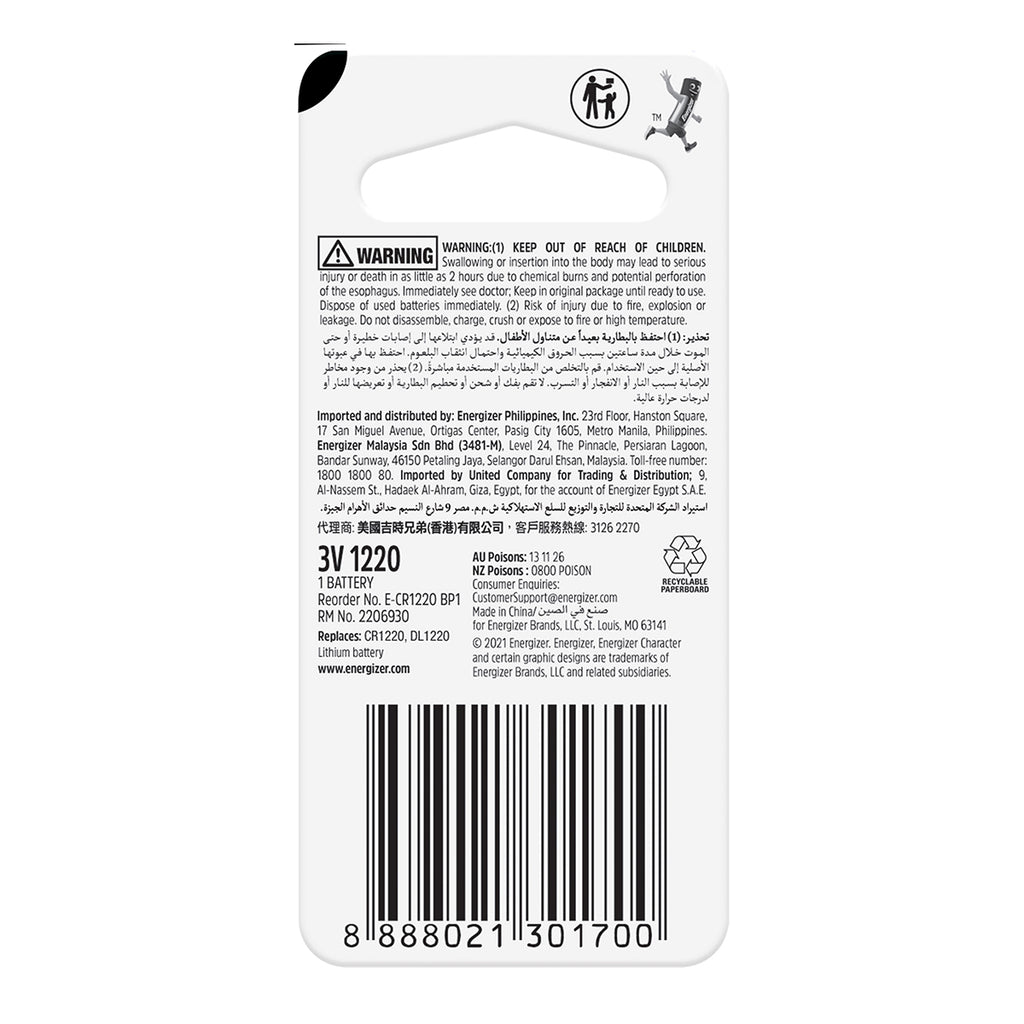 Energizer Battery Lithium Coin 3 V 1220 1 Pack
