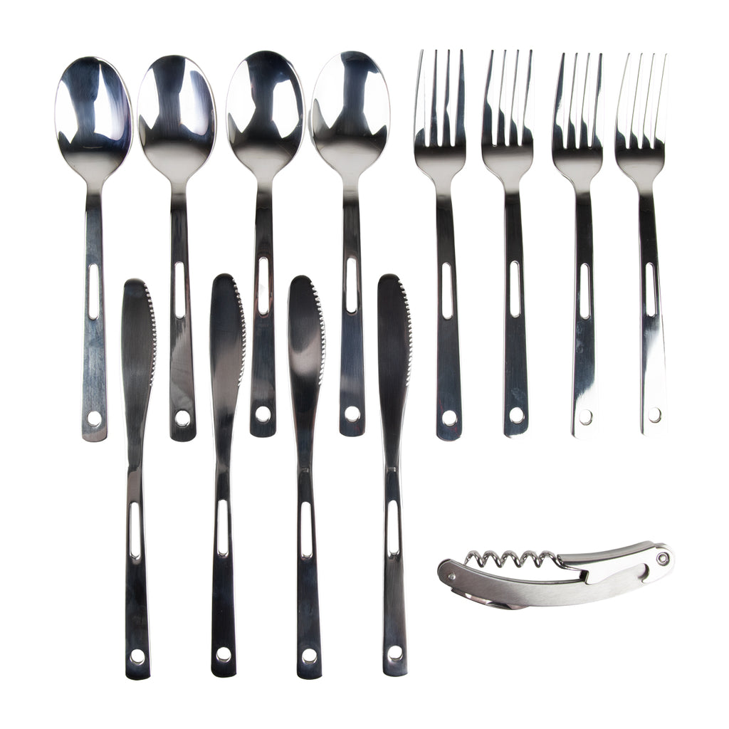The Kaufmann Outdoor Camping Cutlery Set (13 Piece) Offers A Convenient And Stylish Way To Keep All Your Utensils Organized And Accessible During Outdoor Adventures. Whether You're Planning A Family Picnic, A Camping Trip, Or A Beach Day, This Cutlery Set Is Designed To Make Outdoor Dining Easier And More Enjoyable. Features And Benefits: Multipurpose Design: Holds All Cutlery In One Place, Offering Easy Access And Portability. Convertible Stand: Functions As A Display Stand When In Use, Saving Space And Providing Easy Access To Utensils. Durable And Rugged: Made With Tough Polyester And Stainless Steel, Ensuring Long Lasting Use.Fashionable And Stylish: Multicolored Design That Adds A Vibrant Touch To Your Outdoor Setup. Portable: Compact And Travel Friendly, Easily Fitting Into Luggage Or Carried By Hand. Product Specifications: Material: Polyester Case + Stainless Steel Cutlery (Ss410) + Plastic Handles. Weight: 478.5g. Dimensions: 21cm X 11cm. Set Includes: 1 Opener, 4 Knives, 4 Forks, 4 Spoons. **Care Instructions: Avoid Using Harsh Abrasive Cleaners Or Scouring Pads To Prevent Scratches. Do Not Soak The Cutlery In Water For Extended Periods To Prevent Corrosion Or Discoloration. After Use, Dry Thoroughly With A Clean Towel To Prevent Rust Or Water Spots. Store In A Dry Environment To Maintain The Cutlery?S Durability. Keep The Cutlery Out Of Reach Of Children To Avoid Injury. Warranty: One Year Warranty Covering Manufacturing Faults.