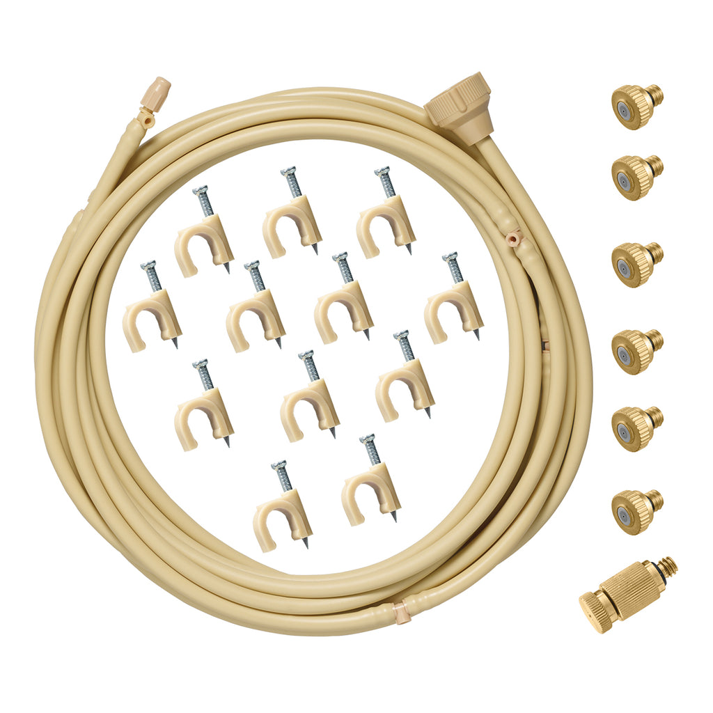 Attaches To Any Garden Hose. Reduces Outdoor Temperature With As Much As 11 Degrees C. Can Be Clipped To An Umbrella. Blank Pipe From Tap To Point Of Installation And Further 3.7m Of Misting Total Of 6m. Includes: 6.7m Flexible Mist Line 3/7inch (6) Mist Nozzles (12) Mounting Clips (1) Drain Valve (1) Connector (1) Washer. To Extend By Another 3.7m Use Product Code 102003 Ek.