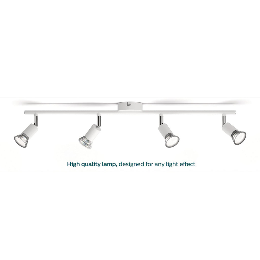 The Philips Limbali Bar/Tube White 4x50 W 230 V Is A Modern And Versatile Spotlight Fitting Designed For Directional Lighting In Residential Or Commercial Spaces. It Accommodates Two Gu10 Lamps (Up To 50 W Each) And Allows Precise Aiming For Accent Or Task Lighting. Supports 4x50 W Gu10 Lamps (Lamps Not Included) .Adjustable Spotlight Heads For Focused Lighting. Sleek White Bar Design Complements Various Decor Styles. Ideal For Kitchens, Hallways, Lounges, Or Shop Displays. Operates On Standard 230 V Mains Power , Ceiling Or Wall Mountable For Flexible Placement. Durable And Easy To Install. This Dual Spot Fixture Provides Functional And Aesthetic Lighting, Allowing Users To Highlight Artwork, Surfaces, Or Workspaces While Maintaining A Clean And Modern Look. Practical Philips Spot Light Ideal For Your Home; Choose The Philips Gu10 Led Bulb To Match The Style Of The Spotlight And Achieve Excellent And Long Lasting Lighting