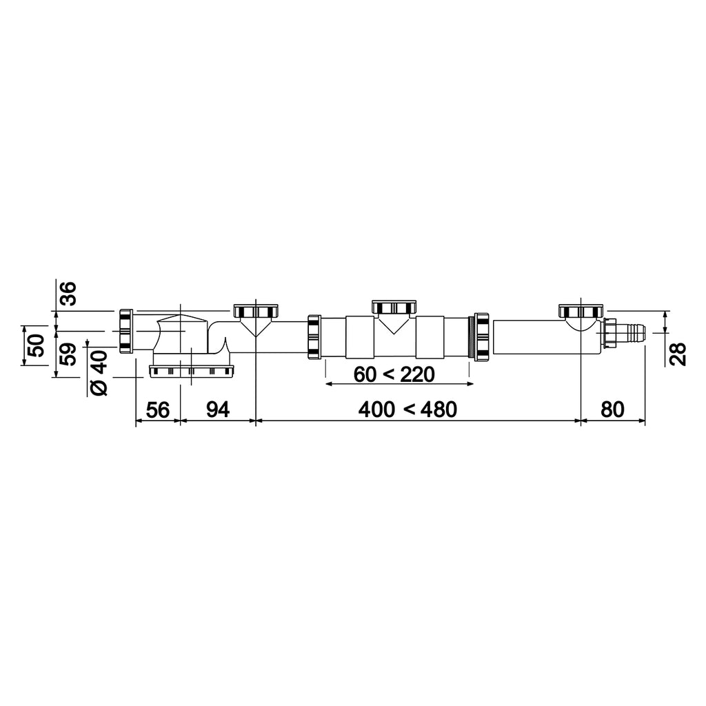 Espace Triple Bowl Sink Trap With Washing Machine Connection. * Centre Distance Of Outer Bowls: 400 480 Mm. * Water Seal: 50 Mm. * Conforms Or Exceeds Nf Standards. * The Perfect Space Saving Solution Under Your Sink. Suitable For Bowls With Outer Waste Outlet Centres From 400 To 480mm Apart. * Washing Machine/Dishwasher Outlet With Non Return Valve. * Orientable Outlet; Makes It Easy To Align To Outlet Pipe. * 40mm To 50mm Pipe Adaptor Supplied. * Built In Trap With 50mm Water Seal. * Easy To Clean Access Cap