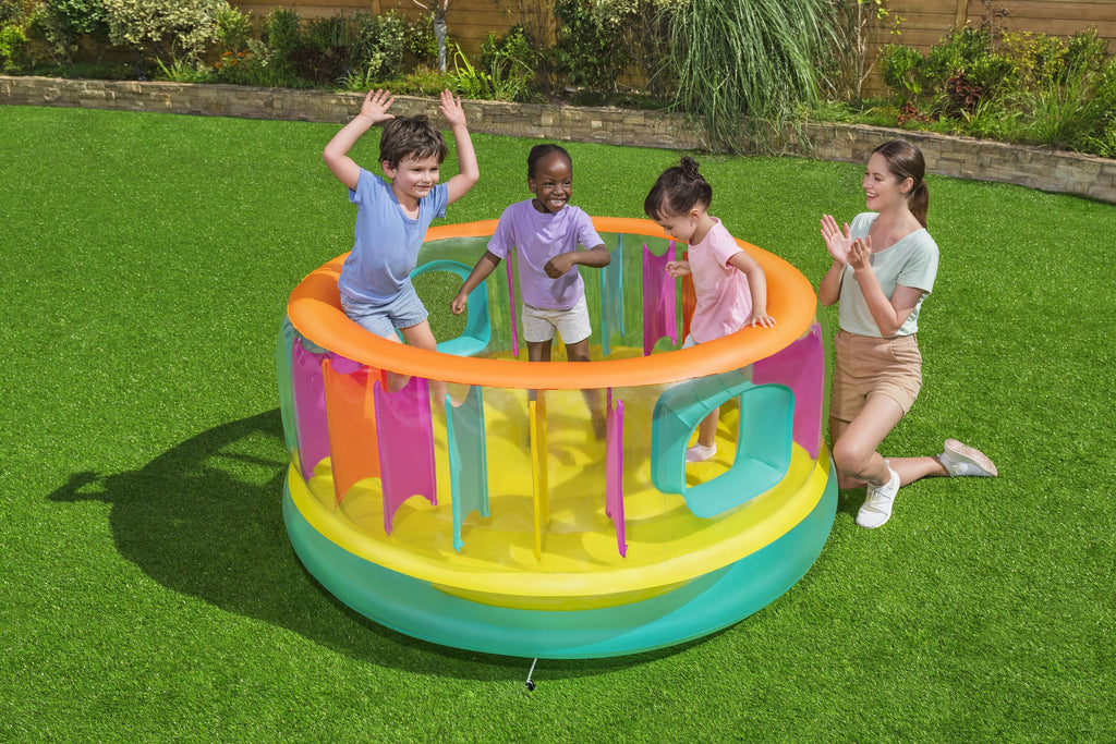 The Bestway bouncejam Bouncer is a safe and easy way for children to enjoy hours of active fun indoors and outdoors. With a thick inflatable base and inflatable sides that completely enclose the Bouncer, your children can jump and play without you needing to worry about them falling out. The fun, bright stripes of colours on the base and sides are sure to be a hit with kids of all ages. The large size, which measures Ø 180cm around and 86cm tall, along with the 85kg weight limit makes it great for several children to enjoy at once. The quality-tested vinyl and solid construction allow it to stand up to tons of bouncing, jumping, rolling, and tumbling. Two small openings, one on either side, make it easy for kids to get in and out, but also help to stop them from falling out accidentally. Safety valves help to lock in inflation even when play-time gets rough. The bouncejam Bouncer also comes with one heavy-duty repair Patch so that you can quickly and easily fix an unexpected tear or puncture.
