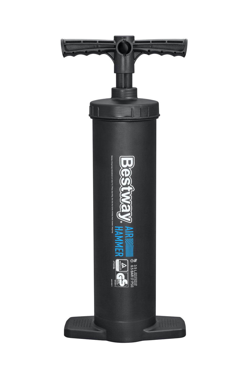 Combine ultimate performance and efficiency with the Bestway® Air Hammer™ double-stroke piston pump! With a size of 48 cm and a stroke volume of 3.5 litres, it is designed for maximum air flow. The pump works with both upward and downward strokes, which shortens the entire pumping process even further. The flexible hose and the 3 different valve adapters allow the pump to be used on many different inflatables. Whether you are using a baby pool, air mattresses, boats etc. - Air Hammer™ pumps it up! The pump is also easy to transport and store.