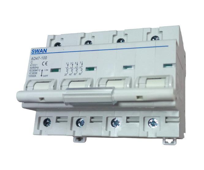 I-Miniature Circuit Breaker Din Rail Mount 4 Pole, Yamanje Ilinganiselwe Ku-100 A Ngekhono Lokuphuka Lama-10 Ka, C Curve.