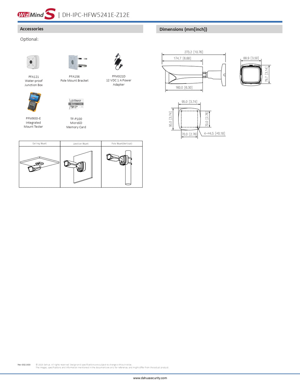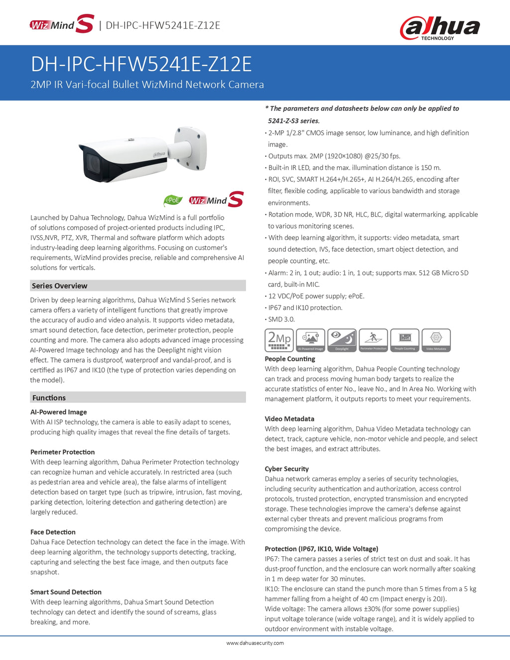 · Rotation mode, WDR, 3D NR, HLC, BLC, digital watermarking, applicable