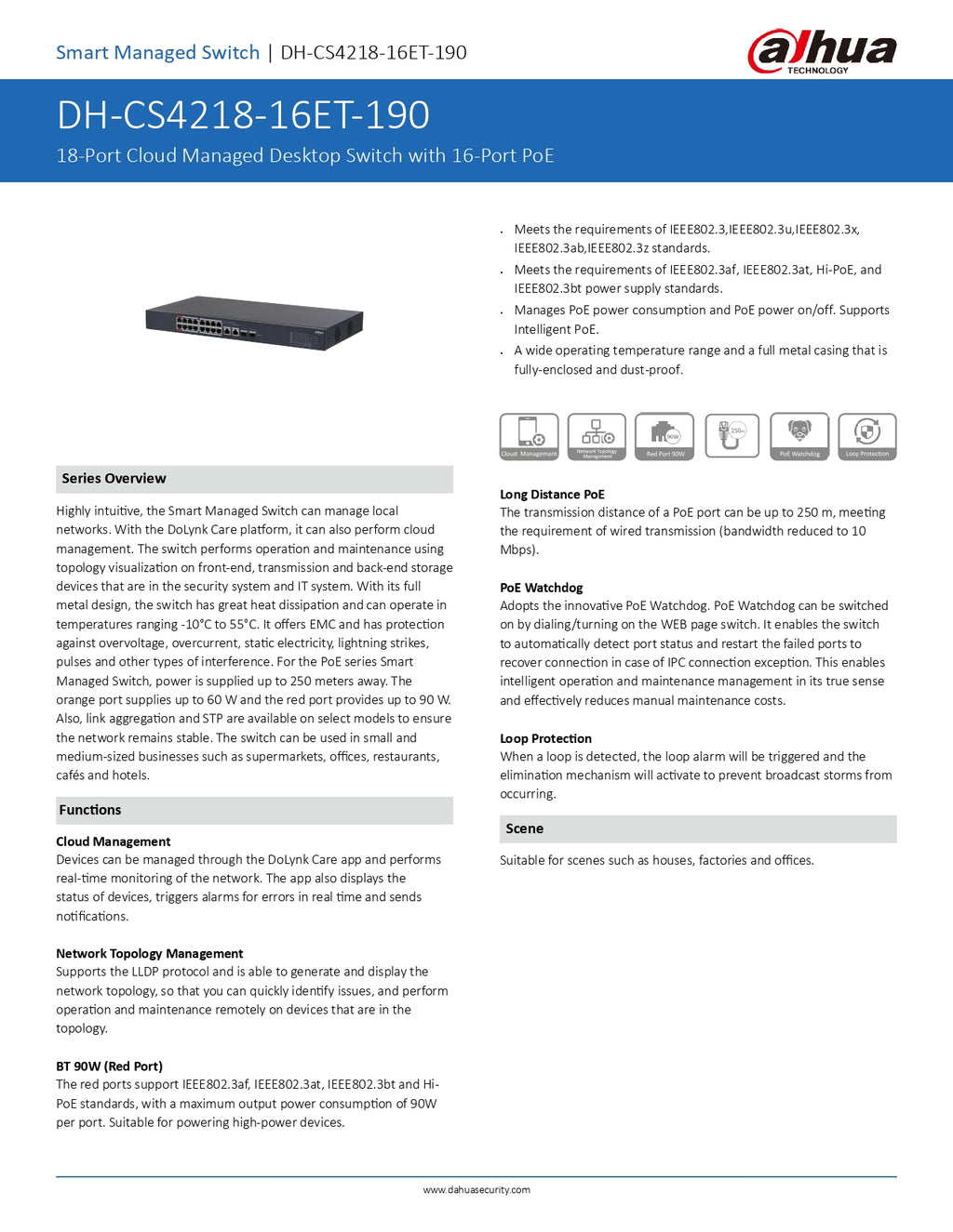 Dahua Gigabit Cloud Managed Switch 18 Port : 16X POE, 2X SFP, 2X Uplink, 190W