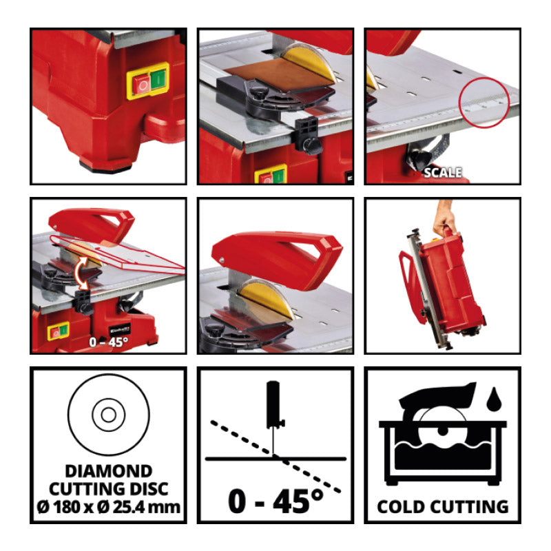 The Einhell Tc Tc 800 Tile Cutting Machine Has A Power Rating Of 800 W. The Robust Stainless Steel Table Is Equipped With An Angle Scale Up To 45 Degrees And Non Slip Feet. For Precise Guidance While Cutting There Is A Parallel Stop With A Scale. For Mitre Cuts The Angle Scale Can Be Adjusted From 45 Degrees To +45 Degrees. An Integrated Water Container Provides The Necessary Water Cooling For The Cutting Wheel. A Cutting Wheel Guard Provides The Necessary Safety During Operation. The Product Comes Complete With A Diamond Cutting Wheel And A Tool For Changing The Cutting Wheel. For Moving Easily To Another Point Of Use There Is A Transport Handle; And For Tidy Storage After Use There Is A Cable Winder.** Features** Tilting Stainless Steel Table With Angle Scale (0 45 Degrees)* Integrated Water Container For Saw Blade Water Cooling* Non Slip Feets For Secure Hold* Parallel Stop With Angle Scale For Exact Straight Cuts* Adjustable ( 45 Degrees 45 Degrees) Angle Stop For Mitre Cuts* Carry Handle For Easy Transport* A Cutting Wheel Guard Provides The Necessary Safety* Complete With Diamond Cutting Wheel And A Tool For Changing* Cable Winder For Tidy Storage After Use