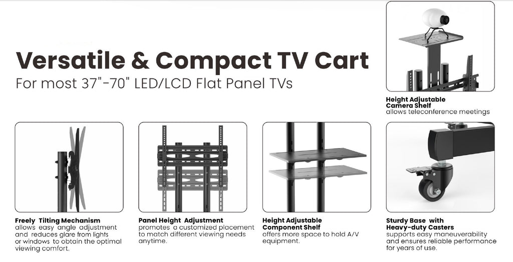 This Economy Multi-functional TV Cart is perfect for a variety of environments, providing a reliable and functional display solution. Whether you're setting up for a presentation, a video conference, or simply displaying information, this cart offers the flexibility and support you need.