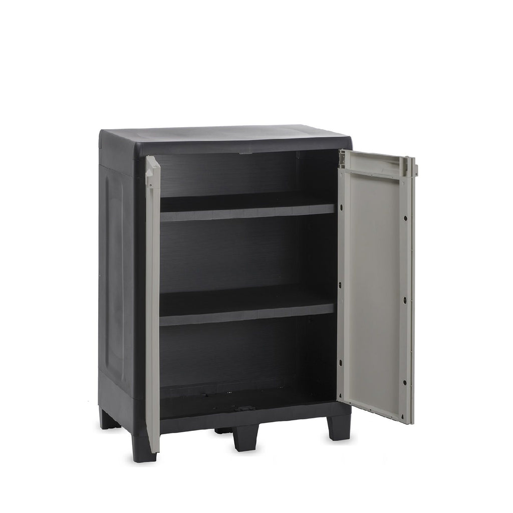 The FACTORY XL short cabinet features a dual-color design, adding vibrancy to its appearance. Equipped with two internal shelves, which are adjustable to different heights, it provides organized space for your items. Made of durable plastic, the cabinet is lightweight and easily portable. Ideal for garages, basements, or outdoor spaces, it combines functionality and style in a simple, versatile design suitable for various storage needs. The doors protect the contents from external elements, making it a practical and reliable option for keeping your items organized and safe.