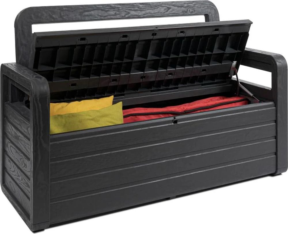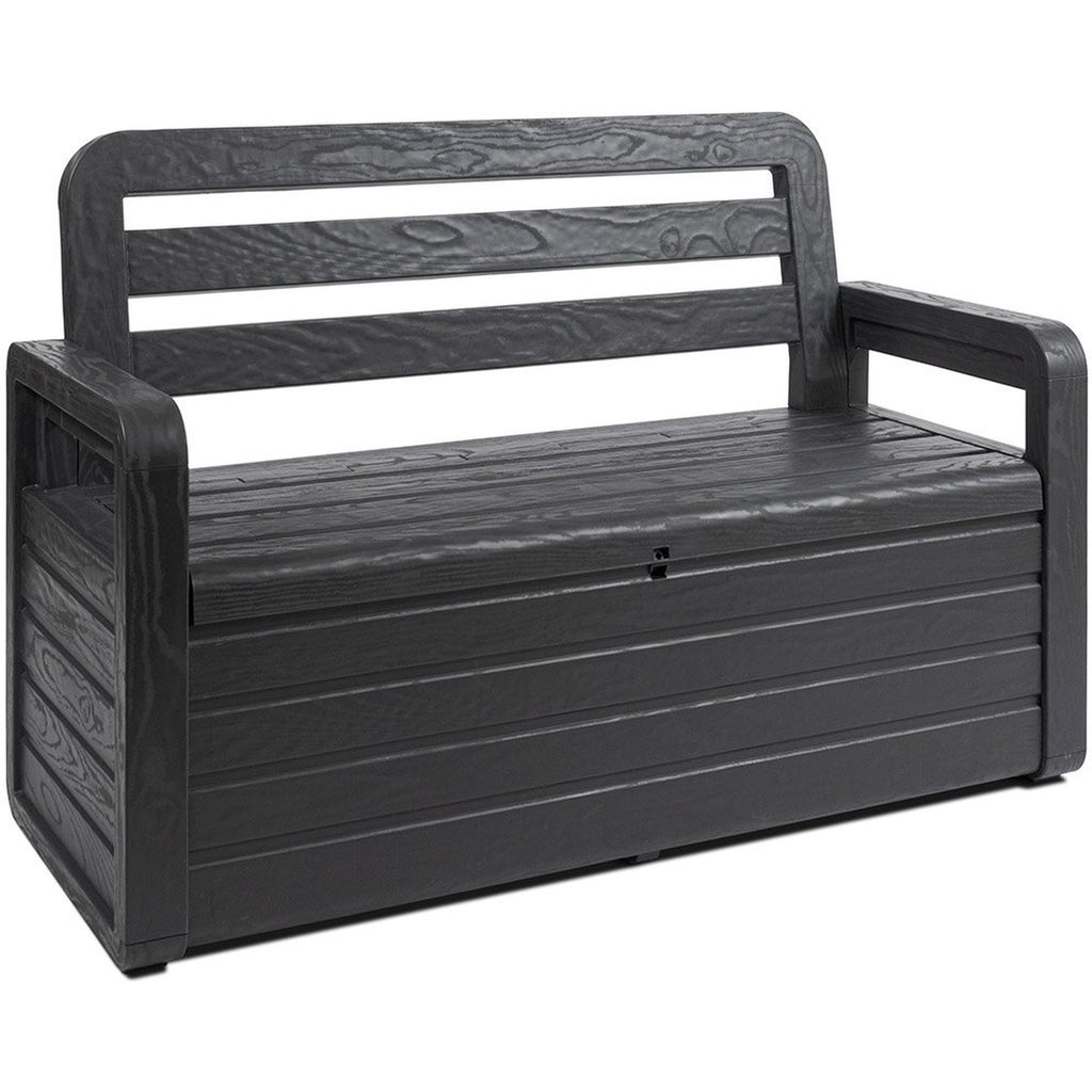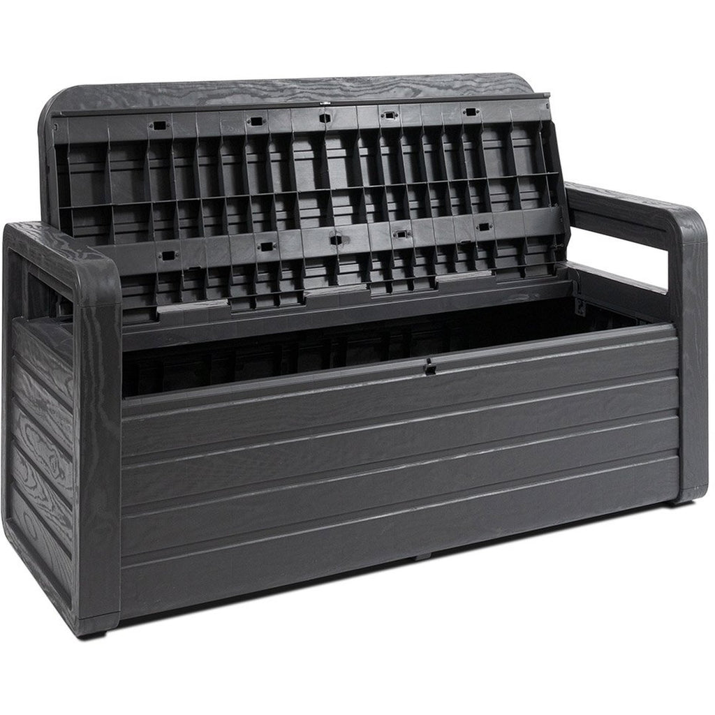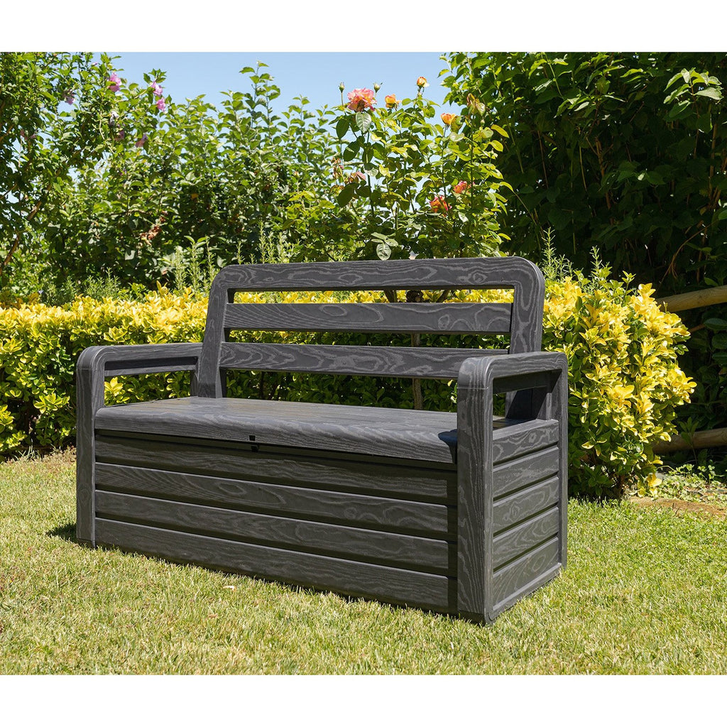 Garden bench with wood finish and opening seat. Internal storage capacity of 263 L. Lockable. Dim: 132,5x58x89h cm