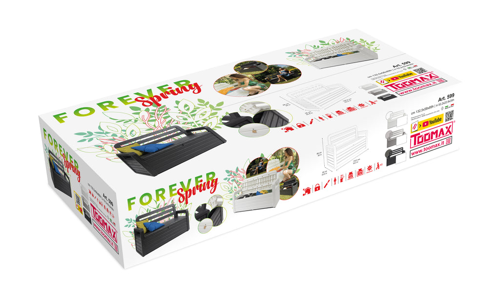 Forever Spring is an outdoor garden bench from the Toomax line, a new product that combines the features of a trunk with a comfortable outdoor bench, featuring a modern design and wood-effect finish. The sturdy seat supports the weight of two people, and the lid is easy to open thanks to the pistons. The padlock hole allows you to secure the trunk safely (padlock not included). Made from recycled and recyclable plastic (polypropylene), it is resistant to UV rays and harsh weather. It requires no maintenance and can be cleaned with a damp cloth and neutral soap.