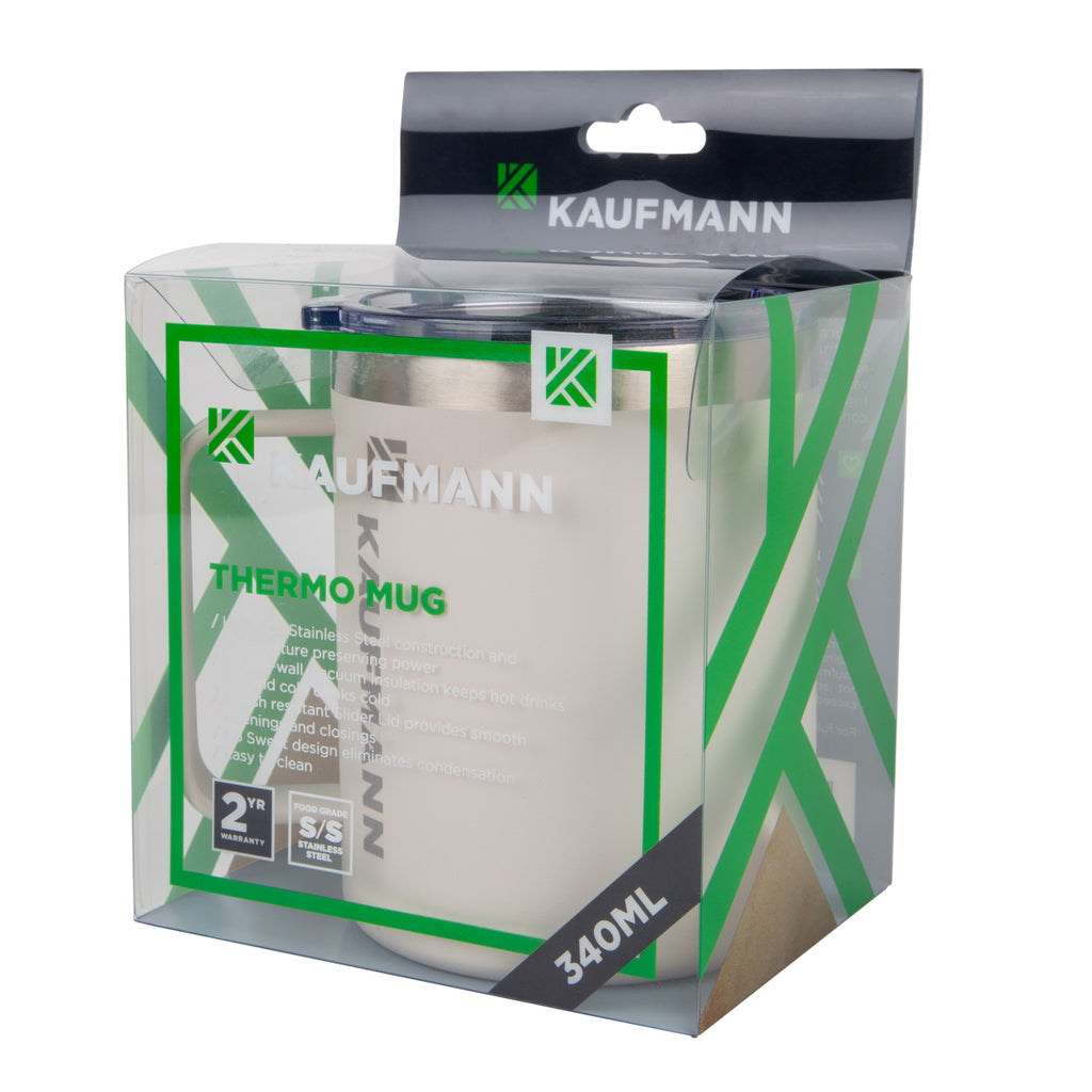 Introducing The Kaufmann Travel Mug In White, A Perfect Blend Of Style And Functionality For On The Go Beverage Enjoyment. This 350ml Travel Mug Features A Double Wall Vacuum Insulated Body, Designed To Protect Your Hands From Hot Or Cold Contents While Keeping Your Coffee, Tea, Or Favourite Drinks Perfectly Insulated. The Wide Opening Allows For Easy Access To Your Drink, Ensuring You Can Enjoy Every Sip Without Hassle. Equipped With A Plastic Magnetic Slider Cap, This Mug Adds An Extra Layer Of Protection To Prevent Heat Or Cold From Escaping. Please Note That The Magnet Component Is Not Leakproof And May Not Prevent Spills, So Handle With Care. For Safety, Avoid Placing The Mug Over An External Heat Source Or Open Flame, As This May Cause Vacuum Seal Failure Or Other Damage. Ideal For Daily Commutes, Outdoor Adventures, Or Simply Enjoying A Cozy Drink At Home, The Kaufmann Travel Mug Is A Stylish And Practical Choice That Enhances Your Drinking Experience Wherever You Are. Enjoy Your Beverages The Way They Were Meant To Be Enjoyed.