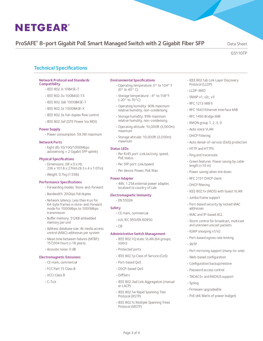 Netgear Gigabit Smart Managed Switch 8 Port: 8x Ethernet ; 2x SFP, 46W