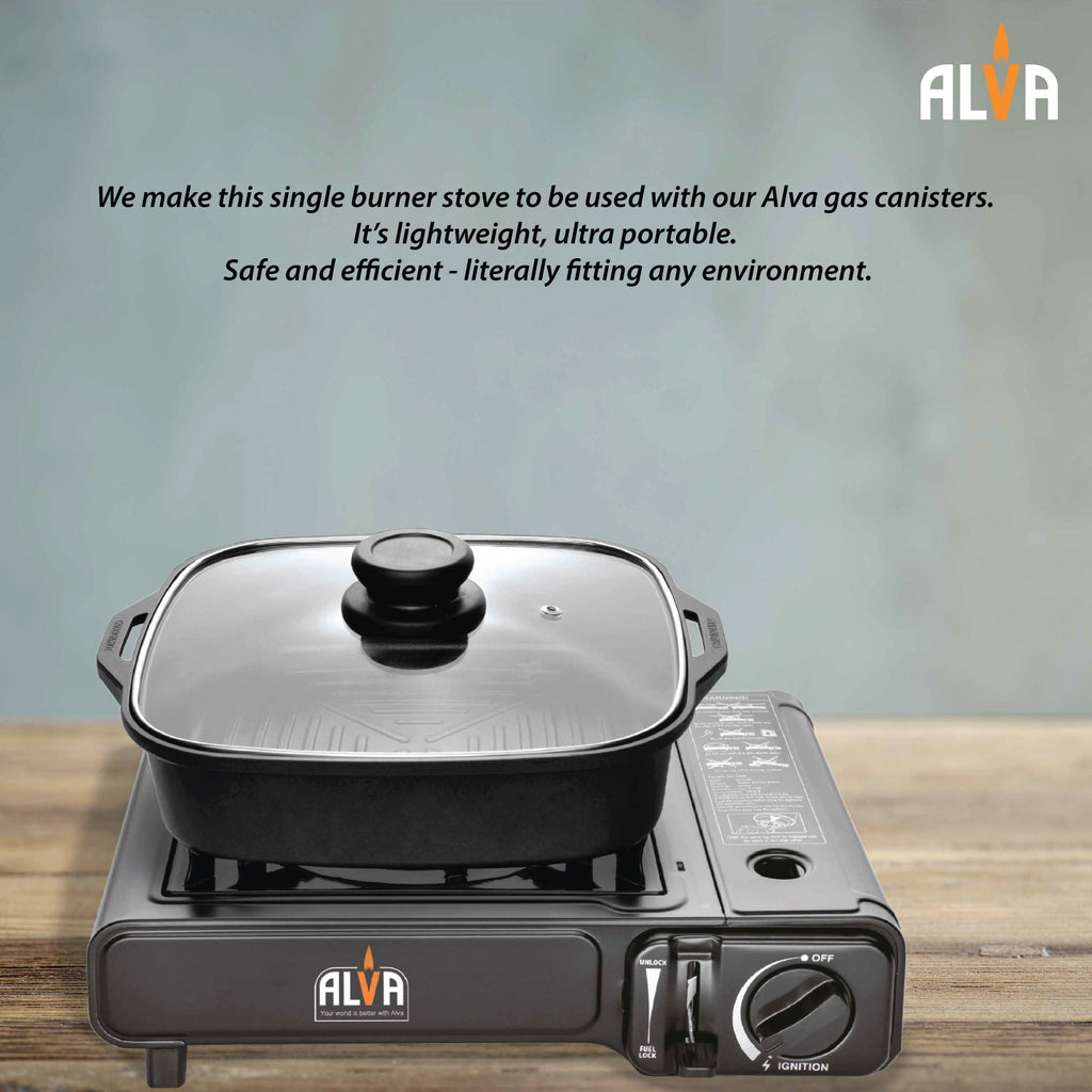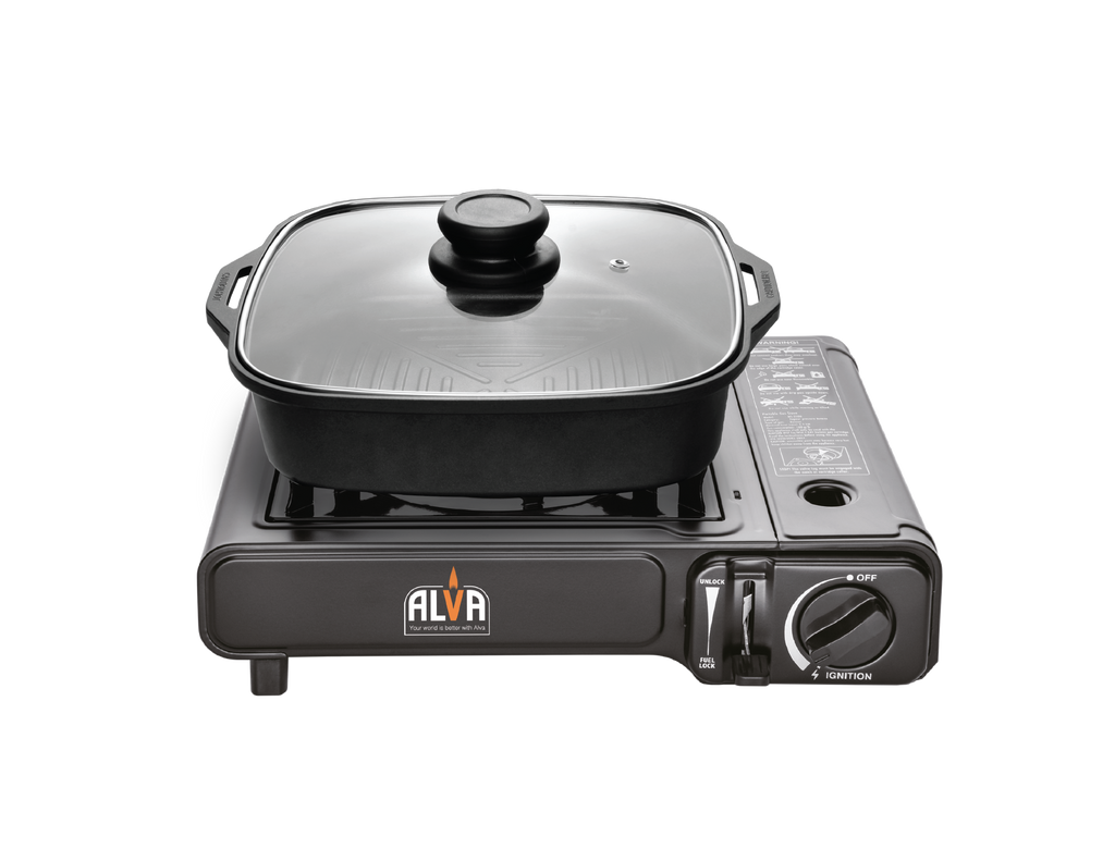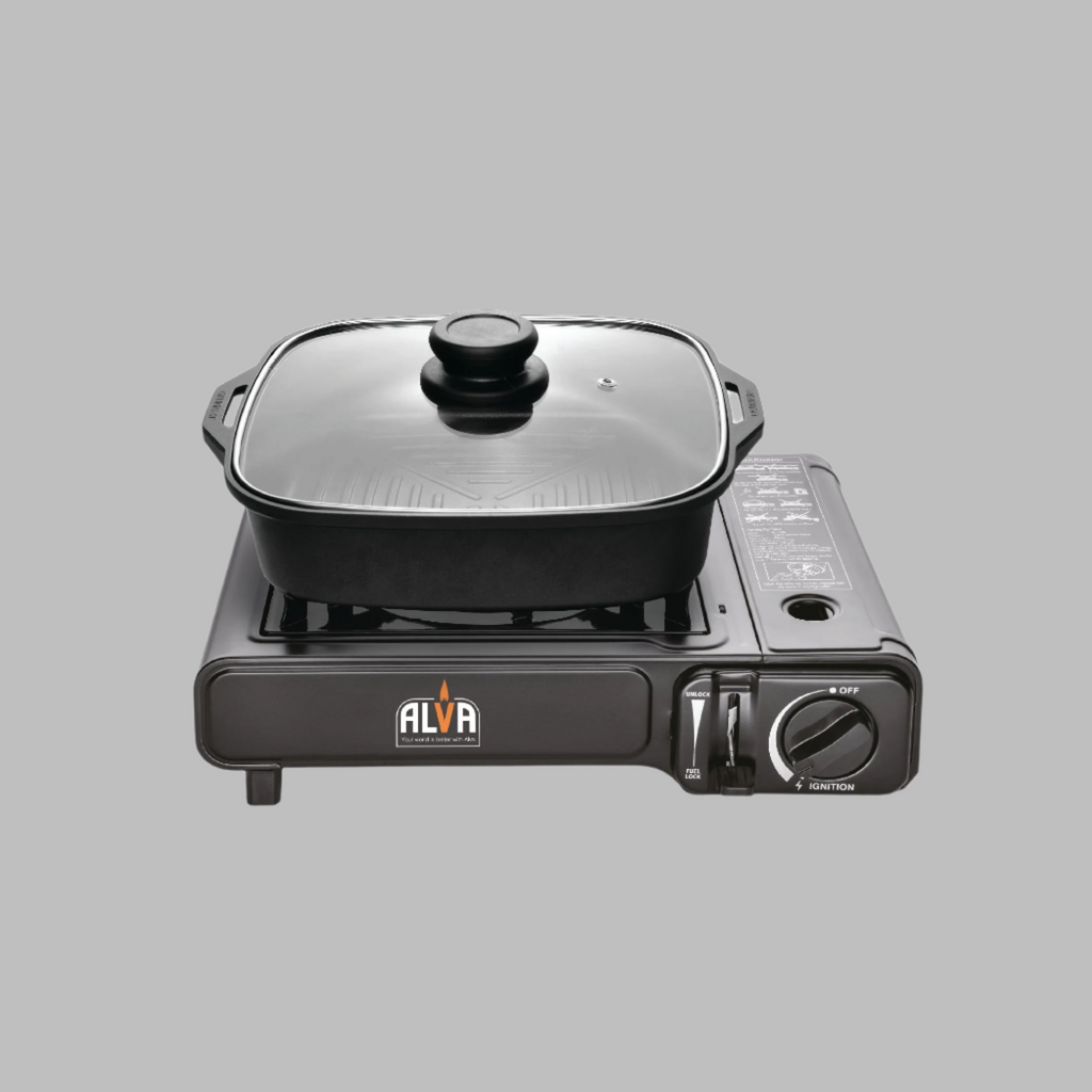 Single Burner Butane Gas Canister Stove + Cooking Pot & Lid 1 Plate