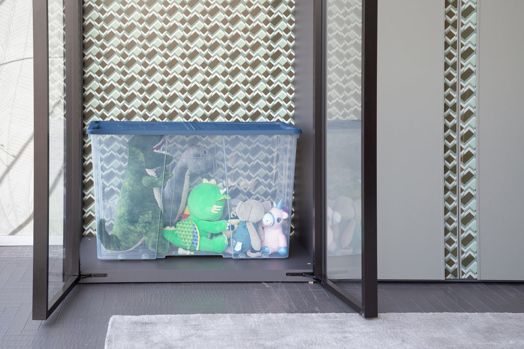 Tall Storage box with double-opening lid and 8 wheels.It is perfect to store objects of any dimension. The ecobox line is completely made of recycled plastic.Volume: 100L.Dimension: cm 77x39x47h..