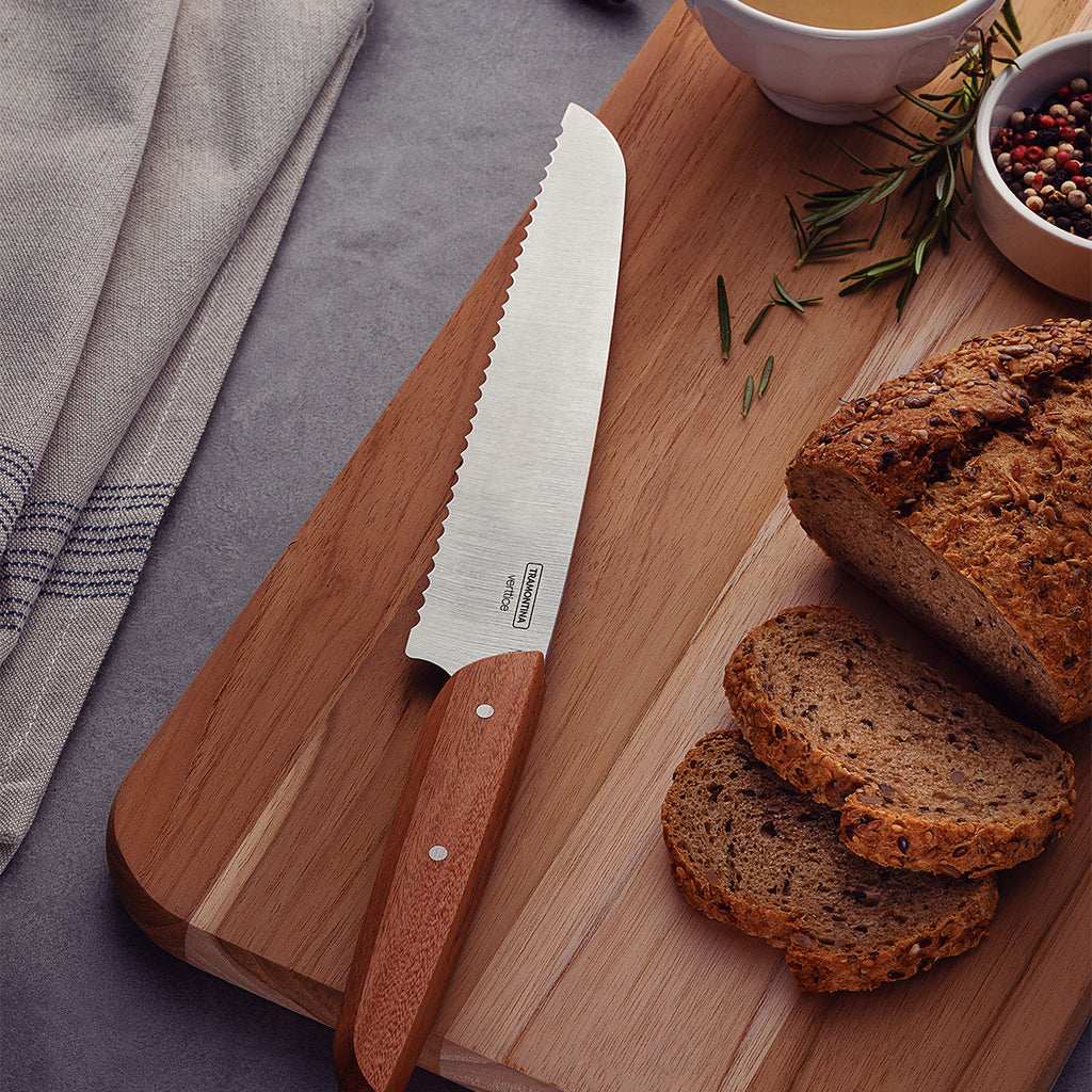 The Tramontina Verttice Bread Knife With A Stainless Steel Blade And Natural Wood Handle Is Perfect For Slicing Various Types Of Bread Without Kneading Them. The Knife Is Produced With A Stainless Steel Blade And Natural Wood Handle And Stainless Steel Rivets That Provides A Rustic Look To The Piece And Greater Durability.