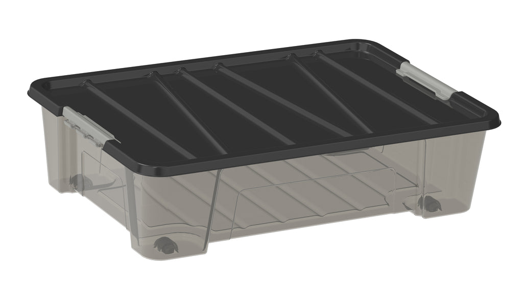 Underbed storage box with lid and four wheelsMade from high quality plastic, it provides clear view if its contents. The snap closure guarantees safe preserving its contentsVolume: 25LDim. cm. 57x39x15.5h.